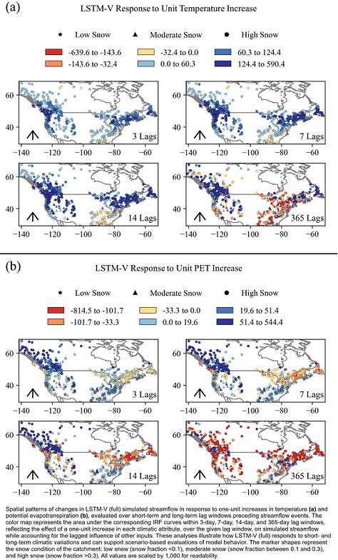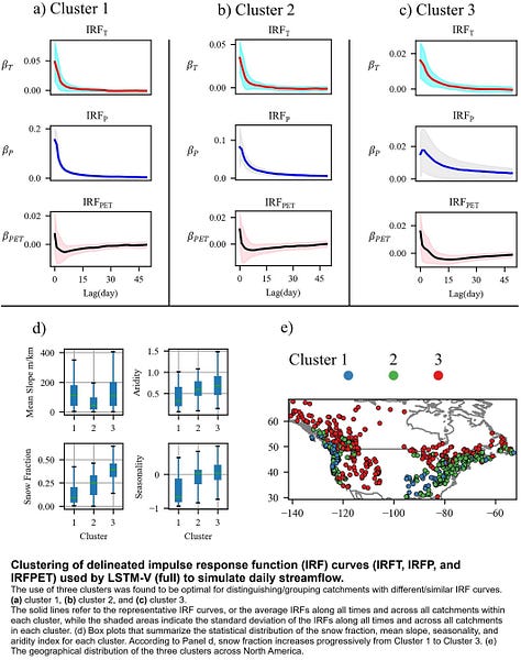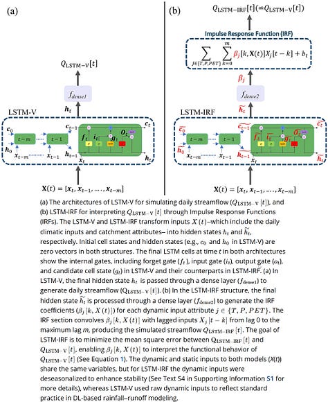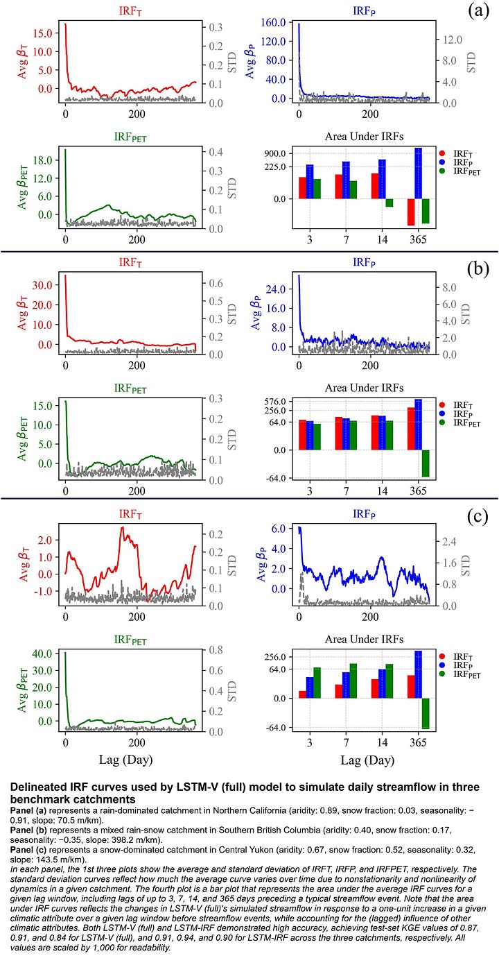 “ABSTRACT: Deep learning (DL) models such as Long-Short-Term-Memory (LSTM) networks have achieved exceptional predictive accuracy in rainfall–runoff modeling. Yet these models learn from statistical correlations rather than hydrologic insights, raising the question of whether their internal functional reasoning is physically reliable. Despite previous studies highlighting unexpected outcomes from LSTMs under long-term climate shifts, functional realism - defined as the extent to which a model’s internal functioning aligns with defensible mechanisms of streamflow generation - remains largely underexplored. [The authors] introduce a hydrology-specific Explainable AI (XAI) framework that opens the black-box of LSTM. It extracts nonlinear, lag-dependent, and time-varying Impulse Response Functions (IRFs) which quantify the functional relationships that LSTM uses to reflect the isolated influence of precipitation (P), temperature (T), and potential evapotranspiration (PET) on simulated streamflow. IRFs reveal how LSTMs internalize streamflow generation during events, offering a catchment hydrology perspective for evaluating model realism. Applying this framework to 672 North American catchments with strong LSTM predictive skill, [they] find that high accuracy often masks hydrologically implausible reasoning: in over 70% of rain-dominated basins, short-term temperature rises unexpectedly raise simulated streamflow and enhance celerity rate even without rainfall; in snow-dominated regions, PET is misattributed as a driver of snowmelt-related flow and enhances the catchment’s celerity rate. [They] conclude[d] that correlation-driven learning can compromise the robustness of LSTM-based forecasts under weather extremes and short-term and long-term climatic shifts. [Their] framework bridges deep learning with hydrologic understanding and offers a scalable diagnostic for assessing the functional realism of DL models across diverse catchment types.
