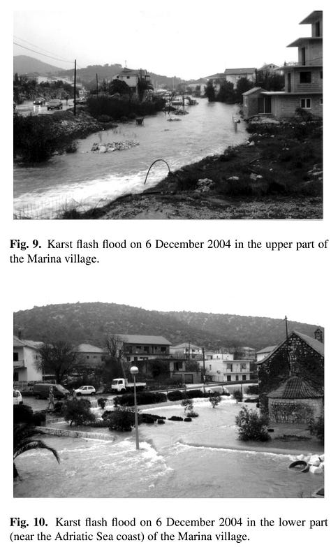 โFlash floods constitute one of the deadliest and costliest natural disasters worldwide. This paper explains the karst flash flood phenomenon, which represents a special kind of flash flood. As the majority of flash floods karst flash floods are caused by intensive short-term precipitation in an area whose surface rarely exceeds a few square kilometres. The characteristics of all flash floods are their short duration, small areal extent, high flood peaks and rapid flows, and heavy loss of life and property. Karst flash floods have specific characteristics due to special conditions for water circulation, which exist in karst terrains. During karst flash floods a sudden rise of groundwater levels occurs, which causes the appearance of numerous, unexpected, abundant and temporary karst springs. This paper presents in detail an example of a karst flash flood in the Marina bay (Dinaric karst region of Croatia), which occurred in December 2004โฆโ