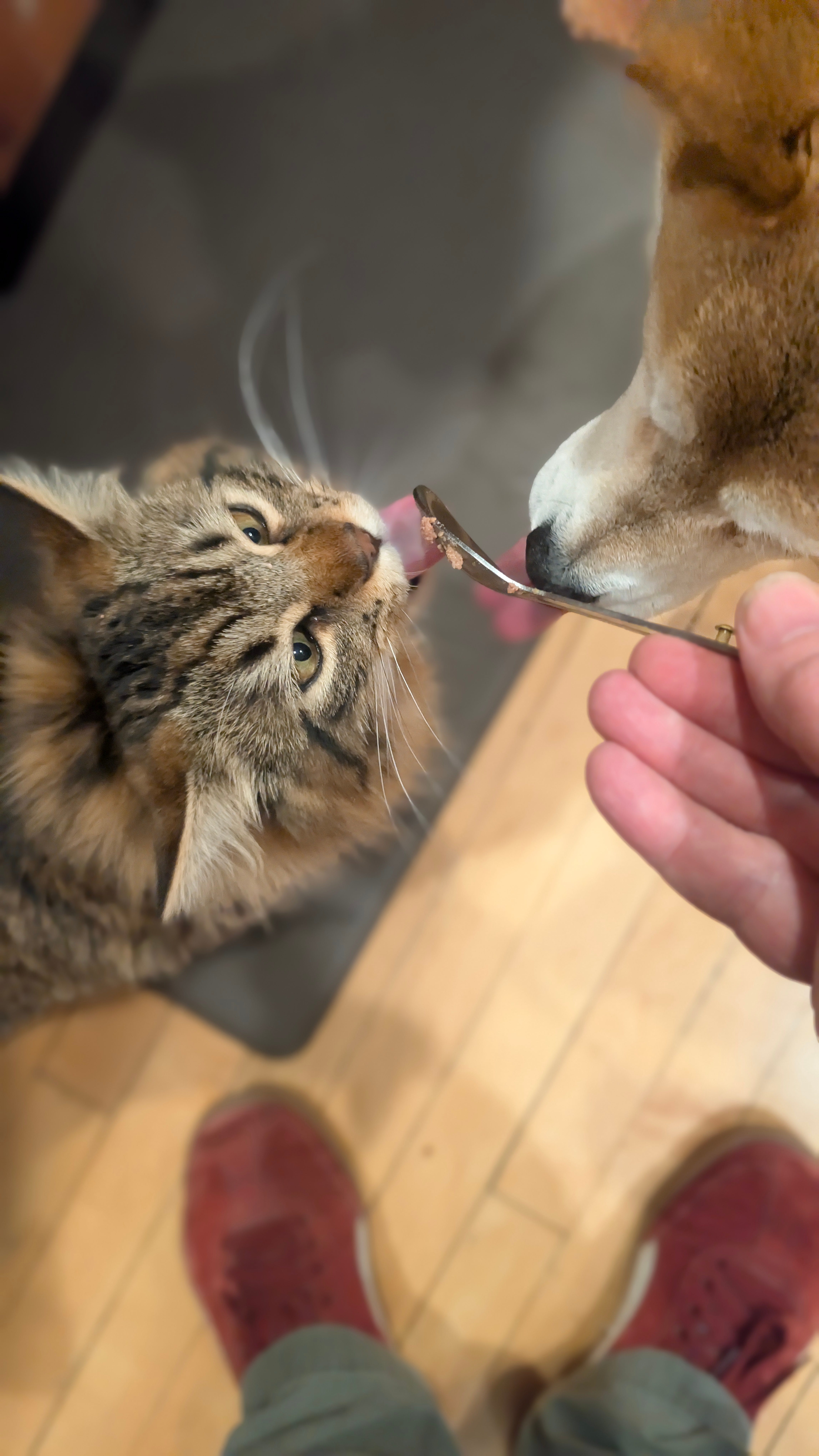 When I feed the critters, Ralphie Meowcchio and Moxie (the #shiba) wait to lick either side of the #spoon, the one that was used to add the wet toppers to the various kibbles; so sweet, and so cool that they get on OK 🙂